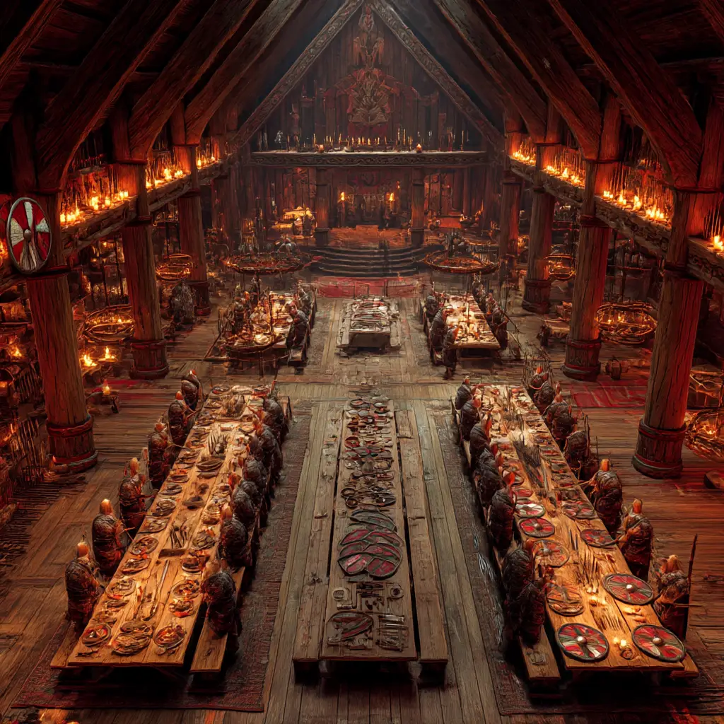 Life in Valhalla follows a daily cycle that reflects the values of Viking Age warrior culture. Each day, the Einherjar arm themselves and fight one another in fierce battles across the fields outside the hall. These fights are not driven by hatred or rivalry, but by the need to train and to prove one’s worth. At the end of the day, all wounds are healed, and those who fell rise again, whole and strong. This endless cycle of battle and renewal removes the fear of death and reinforces the idea that honour and courage are more important than survival.