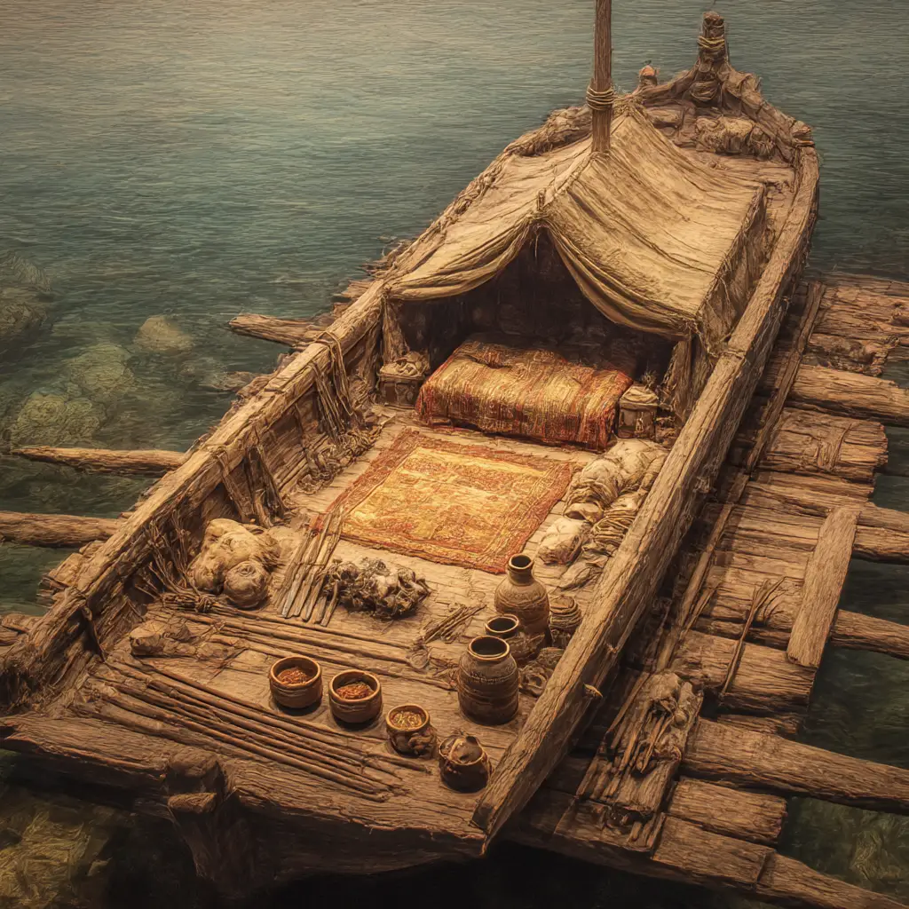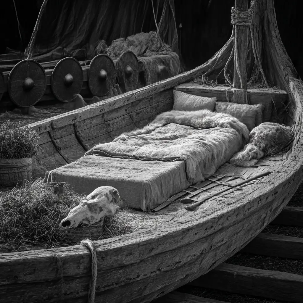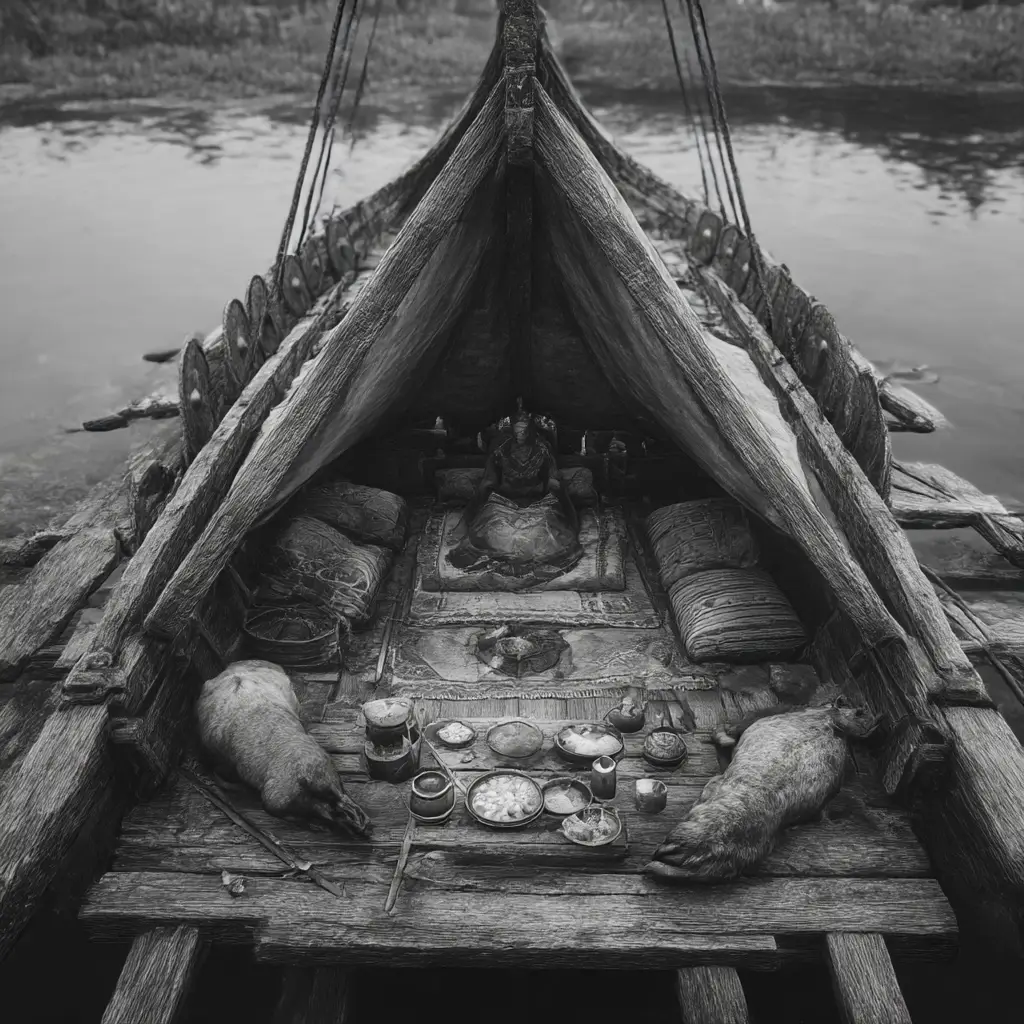The funeral took place on a ship that had been hauled onto land. The vessel was arranged as a kind of platform, with wooden supports beneath it. On board, a structure resembling a tent or small chamber was erected, furnished with cushions and fine textiles. The dead man was washed, dressed in rich clothing, and seated inside this structure. Around him were placed weapons, food, drink, and various goods. Animals were sacrificed, including dogs, horses, and cattle, and their bodies were added to the ship.