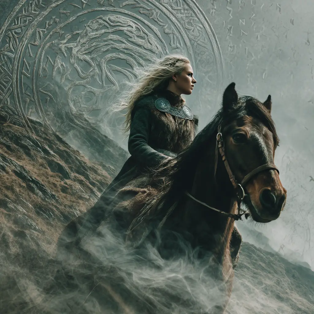 Gná’s defining feature is her ability to travel freely through air and sea, unhindered by distance or obstacle. She rides the remarkable horse Hófvarpnir, whose name means “he who throws his hoofs into the air.” This magical steed can move across the skies and over the waters with effortless speed, making Gná one of the most mobile figures in the Norse pantheon.