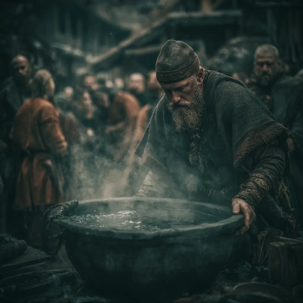 Another ordeal was the ordeal by boiling water. The accused would plunge a hand into a cauldron of boiling water to retrieve a stone or iron object. The hand would then be bound and inspected after several days. If the wound was healing cleanly, the gods were seen to have judged them innocent. If the wound was festering, guilt was assumed. This method was overseen by a lawspeaker or respected elder to ensure fairness.